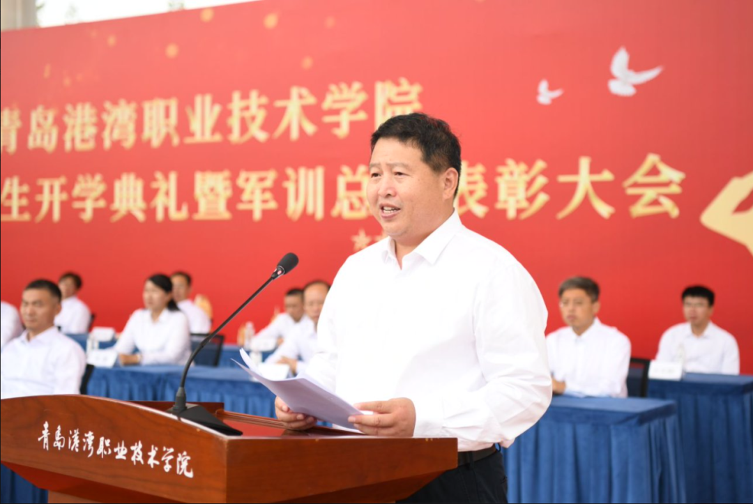 赵庆松在讲话中指出,我们相聚在学院,共同见证2025级新生以军训淬炼的坚毅品格开启大学生涯。值此学院建校50周年之际,这份承载着"校港一体、工学结合"办学传统的荣光将传递到你们手中。作为港口"黄埔军校",学院累计培养的18万人才中,既有像05级史东岳学长那样从翻车机司机成长为全国劳模的典范,也有在智能远控中心操作万吨巨轮的技术精英。虚拟仿真平台和微专业改革等创新资源,将为你们提供翱翔的隐形翅膀。在此,我代表全体师生向新生致以最热烈的欢迎,也向承训部队教官和陪伴成长的老师们致以崇高敬意。